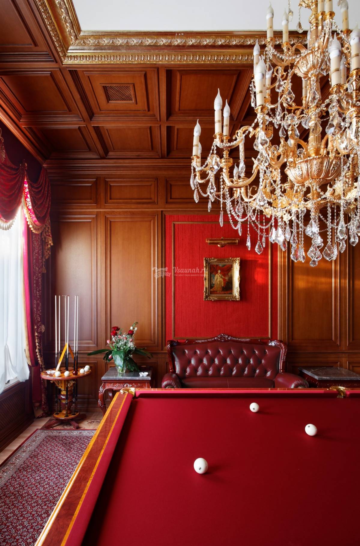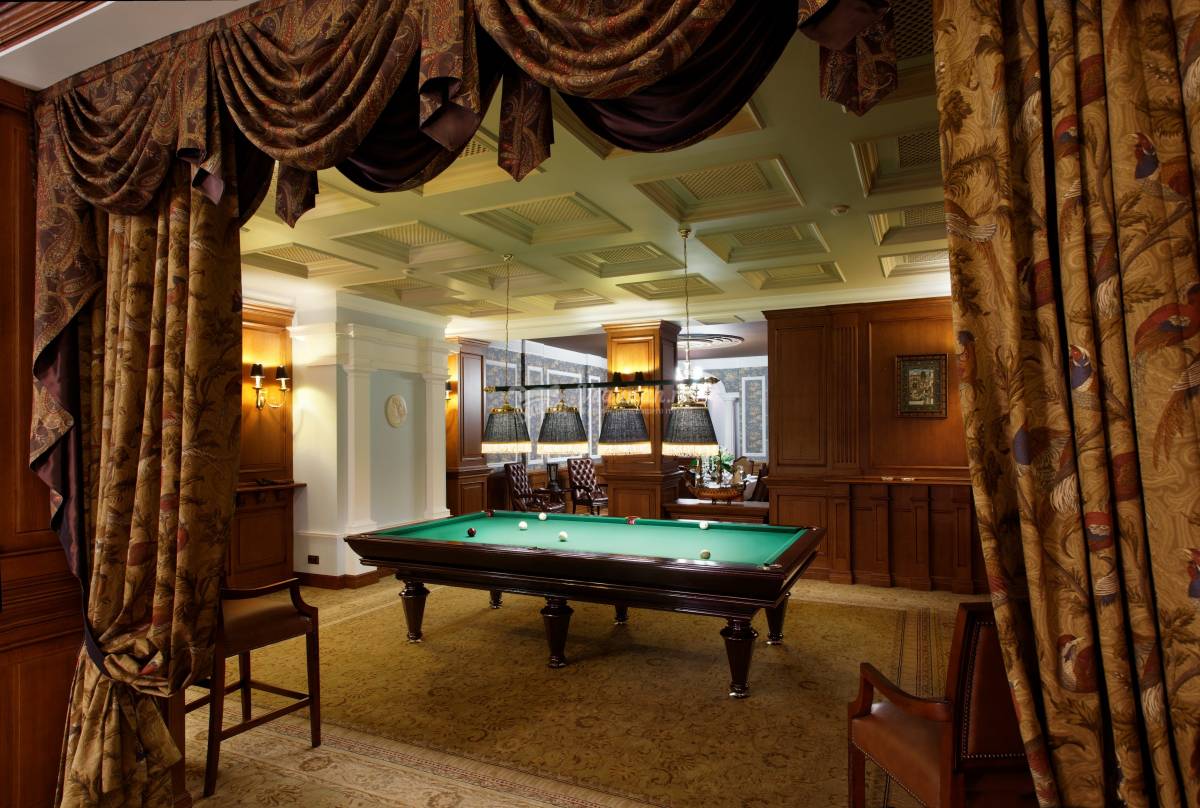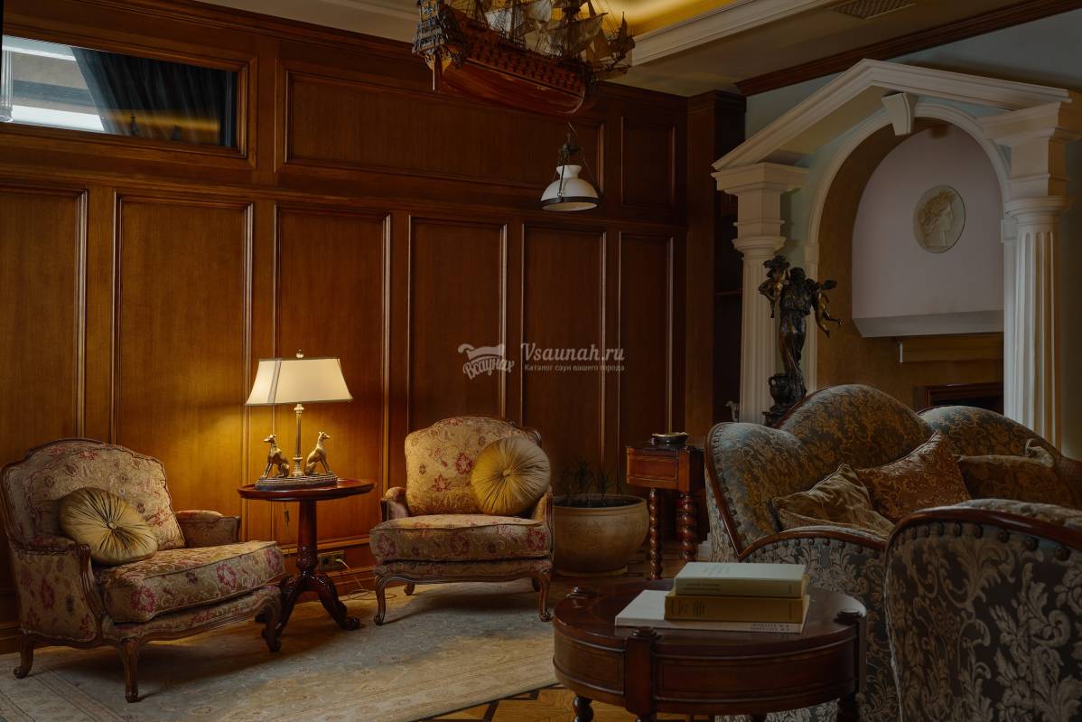 Стильный интерьер, благородное дерево дубовых панелей и наборного паркета. Сдержанный дизайн зала и мягкий уют создадут располагающую обстановку для встречи с деловыми партнерами или беседы старых друзей. Апартаменты могут быть совмещены с соседним спа сьютом «Гламур», что делает их удобными для больших мероприятий и приёма особо важных гостей.